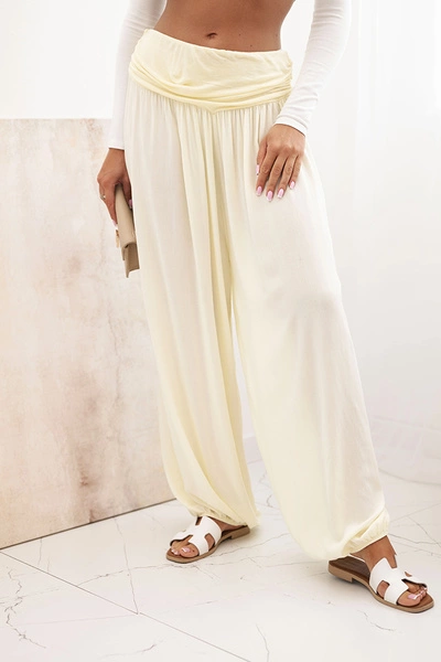 Dámské viskózové kalhoty s širokými nohavicemi a volánky žlutý