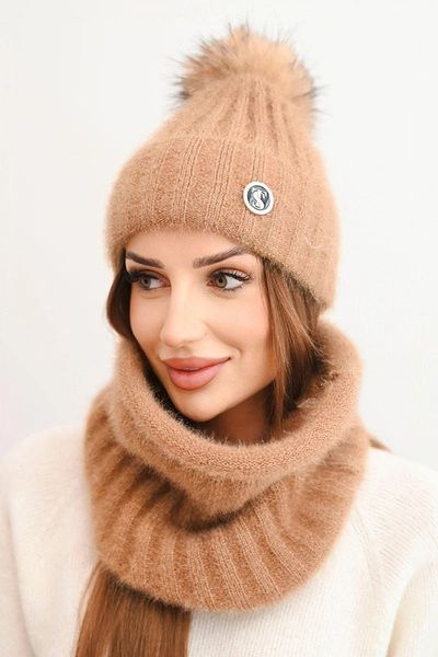 Dámská měkká čepice z alpaky s ozdobnou destičkou tmavě béžová