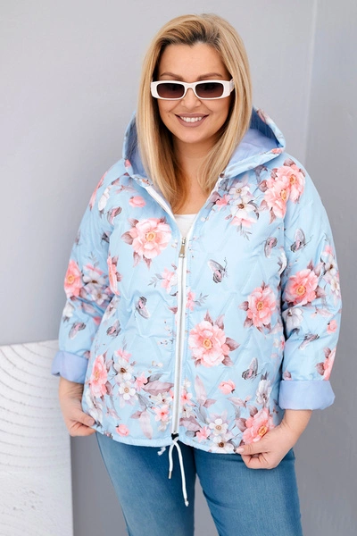 Kurtka damska wiosenna pikowana Plus Size z kapturem i kwiatowym wzorem niebieska