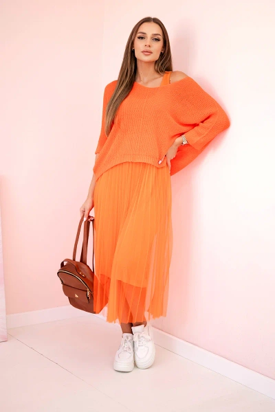 Sukienka plisowana z ażurowym sweterkiem pomarańczowa