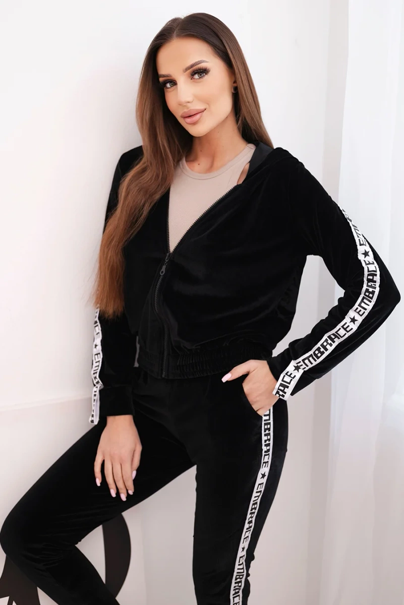 Představujeme vám sadu mikiny a kalhot. Sada z veluru. Mikina má kapuci a zapínání na zip. Ozdobná stuha na ramenou s nápisem. Ve spodní části mikiny je všitá guma. Kalhoty s kapsami a páskou na nohavicích. Velmi módní a stylová sada. Sada je vyrobena z vysoce kvalitního materiálu. Velikost je univerzální a vyhovuje dámám velikosti S, M nebo L.