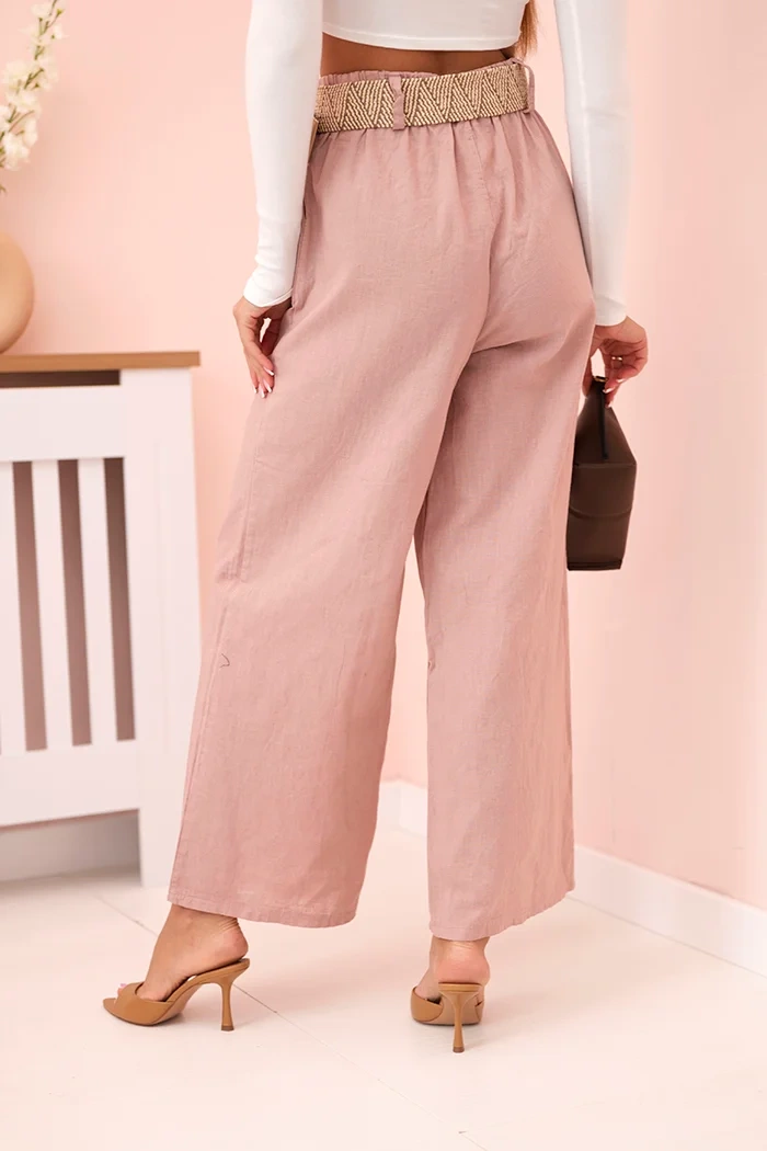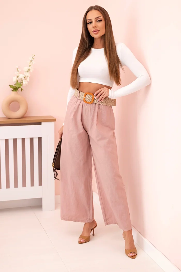 Tyto stylové dámské kalhoty se širokými nohavicemi a ozdobným páskem jsou ideální volbou pro ženy, které si cení pohodlí a módního vzhledu. Vyrobené z přírodního materiálu budou skvělou volbou pro teplejší dny, nabízejí prodyšnost a pohodlí po celý den. Jejich volný, elegantní střih s vysokým pasem krásně tvaruje postavu a stylový pletený pásek zdůrazňuje pas a dodává celku výjimečný charakter. Jedná se o univerzální model, který se perfektně hodí jak pro každodenní stylizace, tak i na elegantnější příležitosti. Skvěle ladí s lehkými halenkami, topy nebo saky. Italská výroba zaručuje vysokou kvalitu zpracování a módní design. Velikost je univerzální a bude vyhovovat ženám velikostí S, M nebo L.