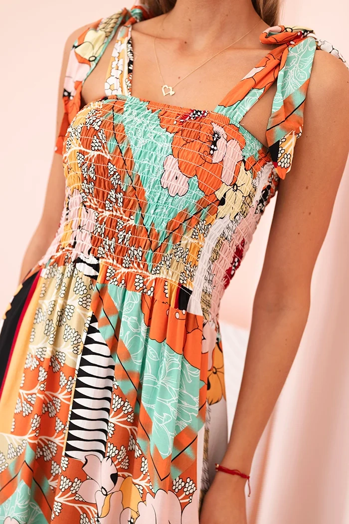 Výjimečné dámské maxi šaty se širokými zavazovacími ramínky jsou ideální volbou na slunečné dny! Zaujmou pestrým květinovým potiskem, který přitahuje pozornost a dodává letní nádech každému outfitu. Horní část šatů je zakončena elastickým řasením, díky čemuž se perfektně přizpůsobí postavě a zajišťuje pohodlí i skvělý vzhled. Dlouhá, volně splývající sukně dodává lehkost a krásně se pohybuje při chůzi. Skvělé na dovolenou, procházky po pláži, zahradní párty nebo letní setkání s přáteli.