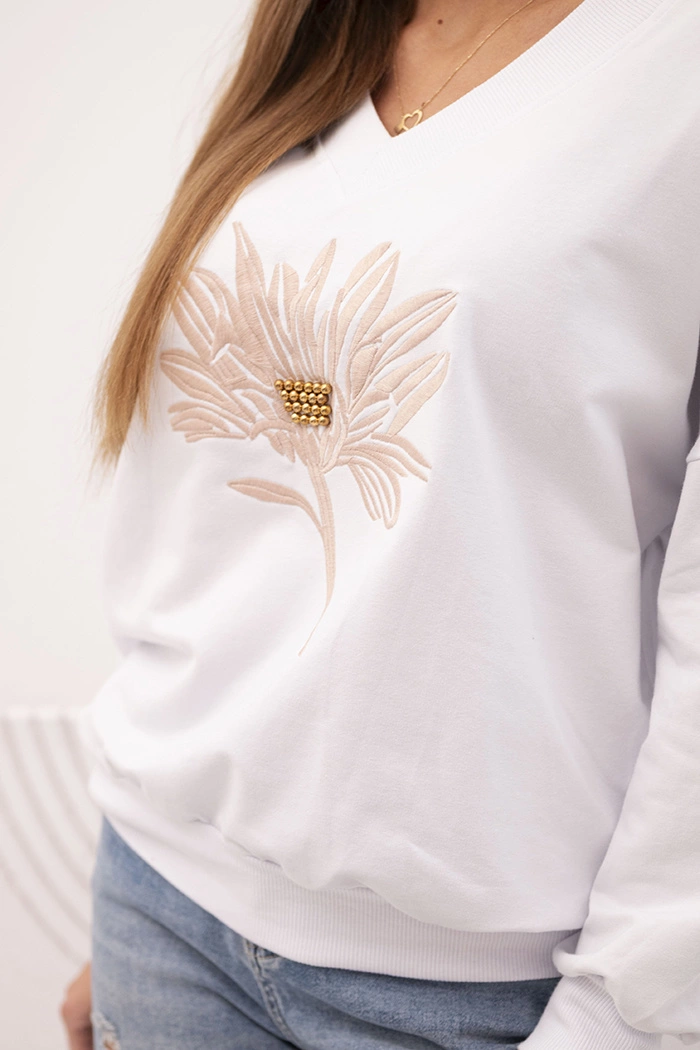 Dámská mikina s výstřihem do V a vyšívaným květem bílá