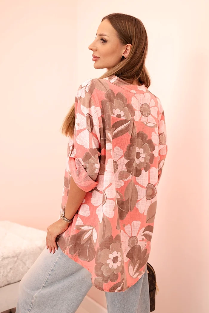 Tato dámská halenka je kombinací pohodlí a stylu, který se hodí skvěle na každý den. Je vyrobená z přírodní, prodyšné bavlny, která zajišťuje pohodlí i v teplejších dnech. Rukáv 3/4, který lze vyhrnout a zapnout na knoflík, nabízí praktickou možnost nastavení a dodává halence lehkost a volný charakter. Volný střih s kapsou na prsou zdůrazňuje casual styl této halenky. Velký, výrazný květinový vzor dodává halence módní a nápaditý vzhled, takže se můžete cítit výjimečně a žensky. Velikost je univerzální a bude vhodná pro dámy ve velikosti S, M nebo L.