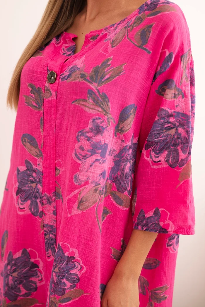Dámská bavlněná šaty s květinovým vzorem a rukávem 3/4 fuchsie
