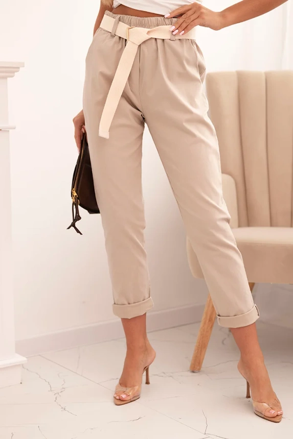 Dámské kalhoty z viskózy s páskem a ohrnutými nohavicemi béžové