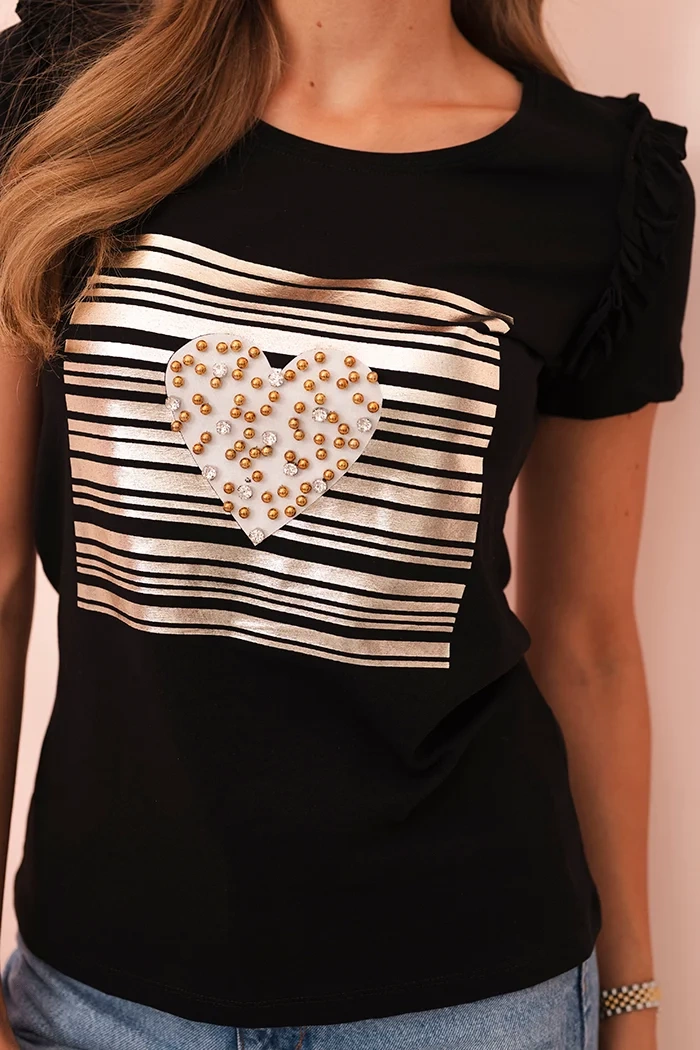Dámská bavlněná blůza s volánem a srdcem z kamínků černá