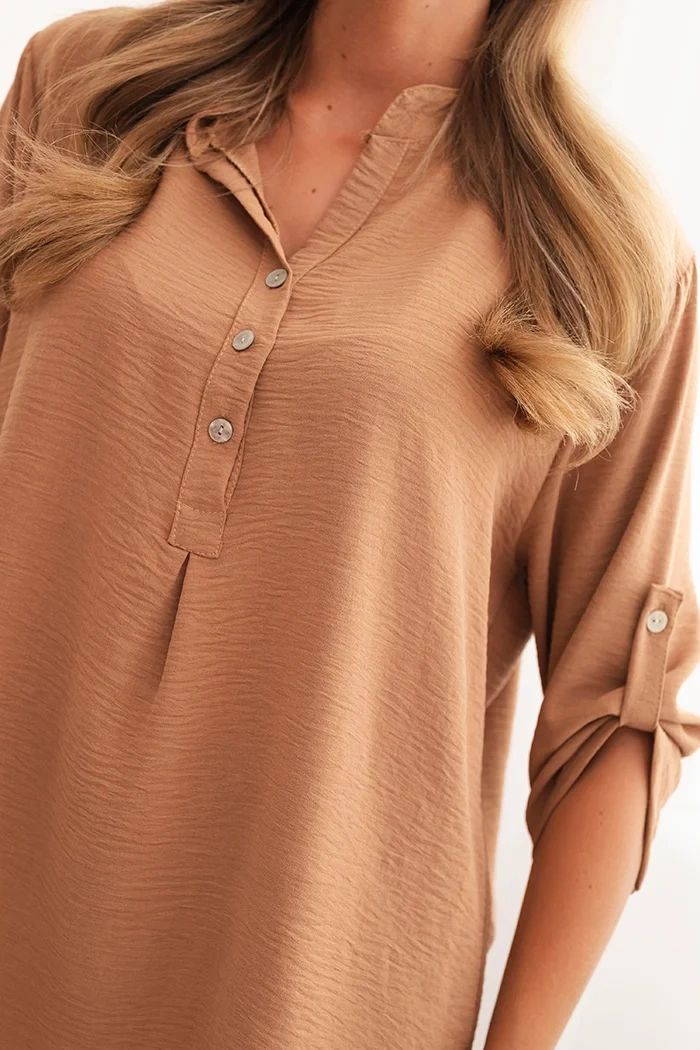Objevte mimořádnou eleganci a pohodlí v prezentované halence s delšími zády, knoflíkovým výstřihem a ohrnutými rukávy, tato halenka nejen vypadá výjimečně stylově, ale poskytuje také bezkonkurenční funkčnost. Ciťte se sebevědomě a elegantně v halence, která podtrhne váš jedinečný styl. Díky delším zadním dílům vytvoříte jemné a módně nepravidelné proporce a knoflíkový výstřih vám umožní upravit si halenku podle vašich preferencí. Vyhrnuté rukávy dodávají halence lehkost a ležérní charakter, ideální pro různé příležitosti. Ať už se jedná o obchodní jednání nebo relaxační kávu s přáteli, naše halenka vám poskytne pohodlí a styl v jednom. Nenechte si ujít příležitost přidat do svého šatníku tuto jedinečnou halenku! Objevte eleganci, pohodlí a funkčnost v jednom a zdůrazněte svůj jedinečný styl ještě dnes. Velikost je univerzální a bude vhodná pro ženy, které nosí velikost S, M nebo L.