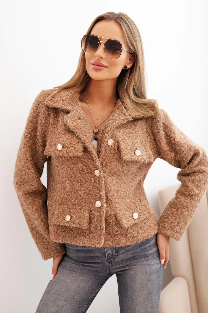 Stylová dámská bunda s příměsí vlny je ideální kombinací elegance a pohodlí na chladnější dny. Vyrobena z měkkého materiálu s jemně nadýchanou strukturou vypadá velmi efektně, a zároveň je nesmírně pohodlná na nošení. Klasický límec, dekorativní kapsy s klopami a zlaté knoflíky jí dodávají šarm a moderní charakter.