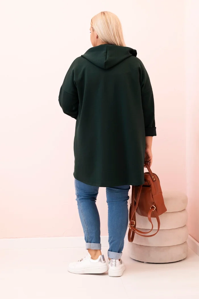 Tato dámská mikina plus size je vynikající volba pro ženy, které si cení pohodlí a módního, volného stylu. Vyrobena z měkké směsi polyesteru, viskózy a elastanu, skvěle sedí na postavě a neomezuje pohyb. Model s rozepínáním na zip a dekorativním kroužkem u zipu dodává moderní charakter, a kapuce zvyšuje funkčnost. Na rukávu se nachází módní potisk ve streetwear stylu, který přitahuje pozornost a podtrhuje sportovní styl mikiny.