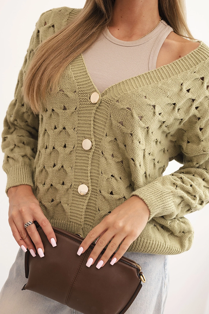 Tento roztomilý dámský svetr s ažurovým vzorem je ideální volbou pro ženy, které si cení elegance a pohodlí. Model se zapínáním na efektní zlaté knoflíky a hlubokým výstřihem do V mu dodává jemný půvab a ženský charakter. Volnější střih zajišťuje, že svetr krásně sedí na postavě, neomezuje v pohybu a hodí se jak k džínům, tak k sukním. Svetr bude skvělou volbou na chladnější dny – vezmete si ho do práce, na procházku, schůzku s přáteli nebo jako součást ležérního outfitu. Lehký a prodyšný ažurový materiál zajišťuje pohodlí po celý den. Velikost je univerzální a bude vhodná pro dámy velikosti S, M nebo L.
