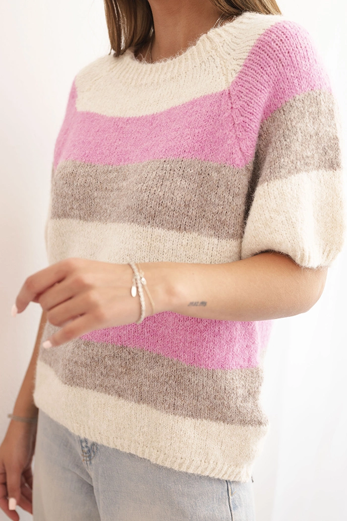 Stylový dámský svetr s pruhy je kombinací pohodlí a nadčasového designu. Vyroben z měkké a příjemné pleteniny s přídavkem vlny, zajišťuje komfort nošení po celý den. Krátký rukáv z něj dělá skvělou volbu na teplejší dny nebo jako prvek vrstveného stylingu.