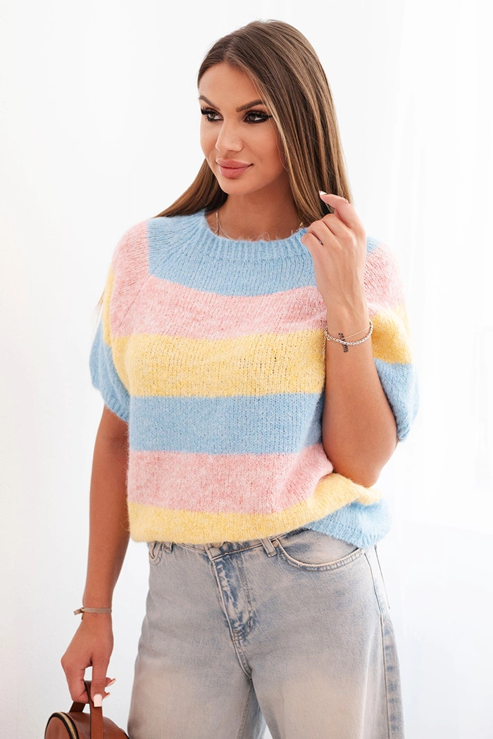 Dámský svetr s krátkým rukávem pruhovaný z vlny žlutý + modrý