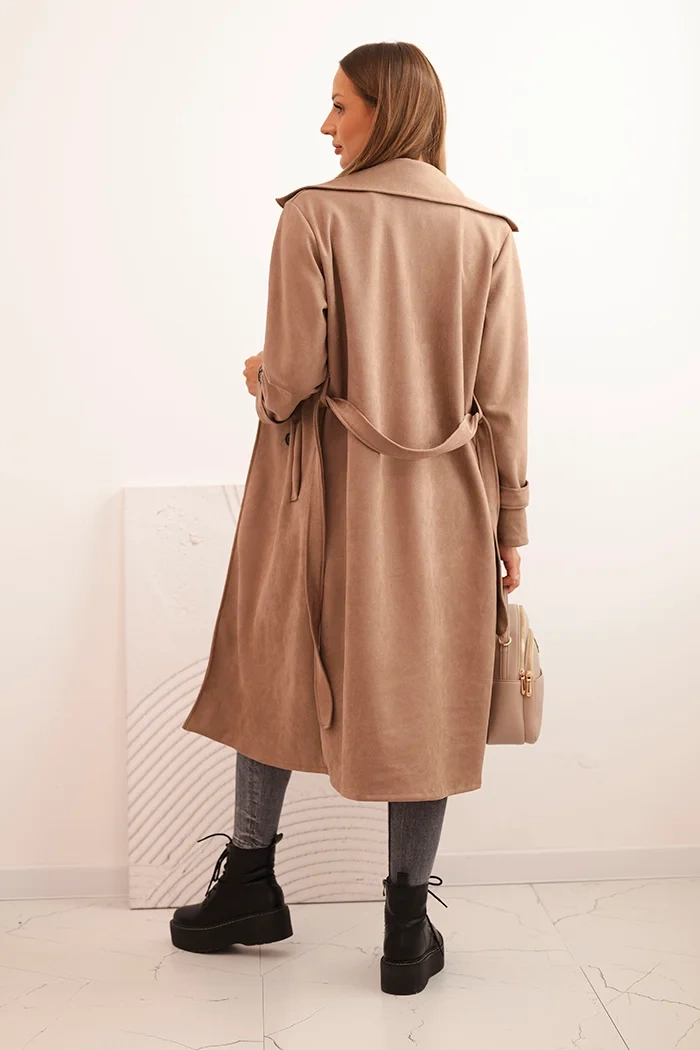 Dámský zamšový kabát v pase vázaný s límcem a knoflíky fango