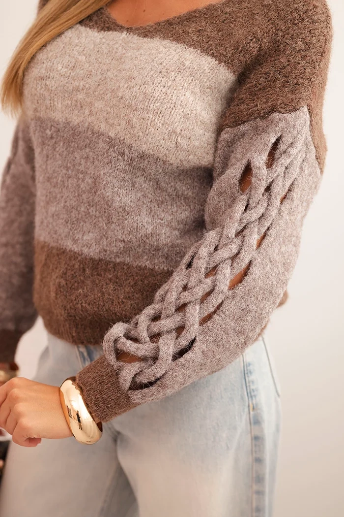 Dámský svetr s pruhy a copánky na rukávech z vlny hnědý + fango
