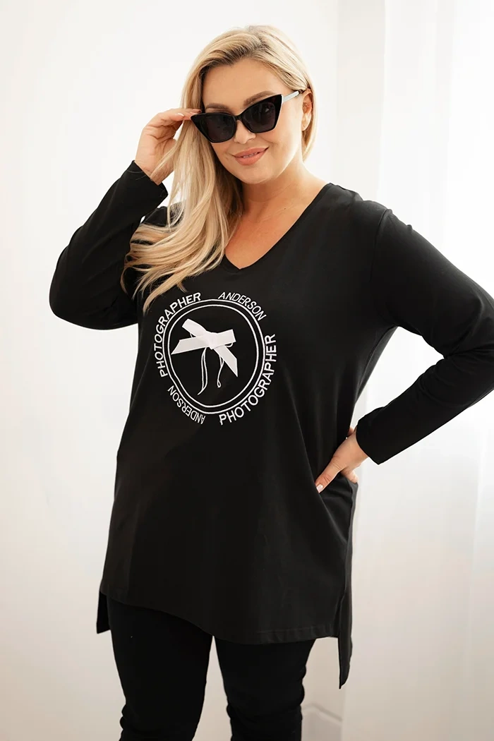Přední část zdobí módní potisk ve streetwear stylu, který dodává celku moderní charakter. Zadní díl je mírně prodloužený, což opticky zeštíhluje postavu a zajišťuje dodateční komfort nošení. Skvělý návrh pro každodenní styling – jak k džínům, tak k legínám.