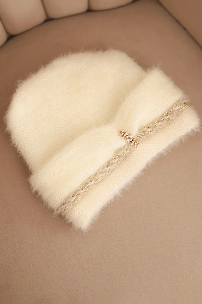 Elegantní a ženská zimní dámská čepice vyrobená z měkké, nadýchané pleteniny je ideální volbou na chladnější dny. Model se vyznačuje dekorativním, pleteným zakončením a aplikací s perličkami a lesklými kamínky, které dodávají celku luxusní charakter.