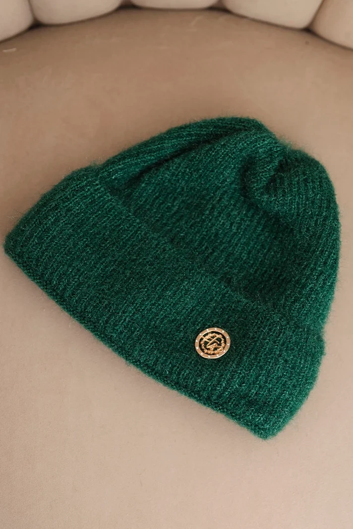 Model je ozdoben zlatým knoflíkem vpředu, což mu dodává eleganci a odlišuje ho od klasických čepic. Jemná, jednolitá barevnost zajišťuje, že čepice se hodí k mnoha zimním stylizacím – jak každodenním, tak i elegantnějším.