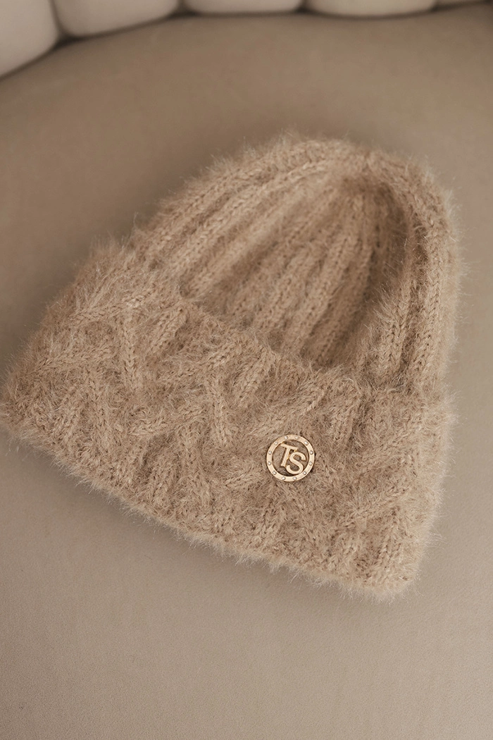 Dámská zimní čepice z huňaté pleteniny a s elegantním knoflíkem bežová