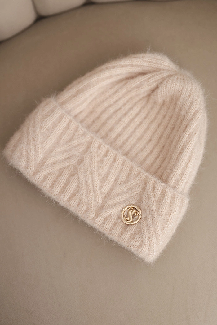 Čepice je ozdobena elegantním zlatým knoflíkem vpředu, který jí dodává jedinečný charakter. Jemná pastelová barva se skvěle hodí do ženských zimních stylizací.