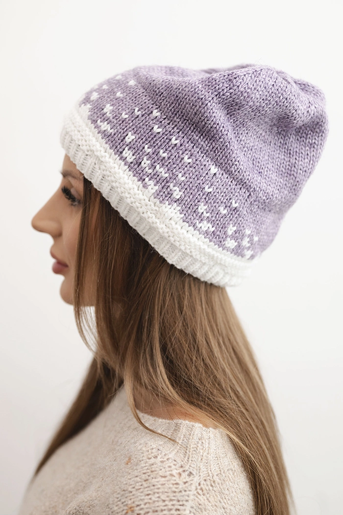 Dámská zimní čepice z vlny s geometrickým vzorem K477 fialová + bílá