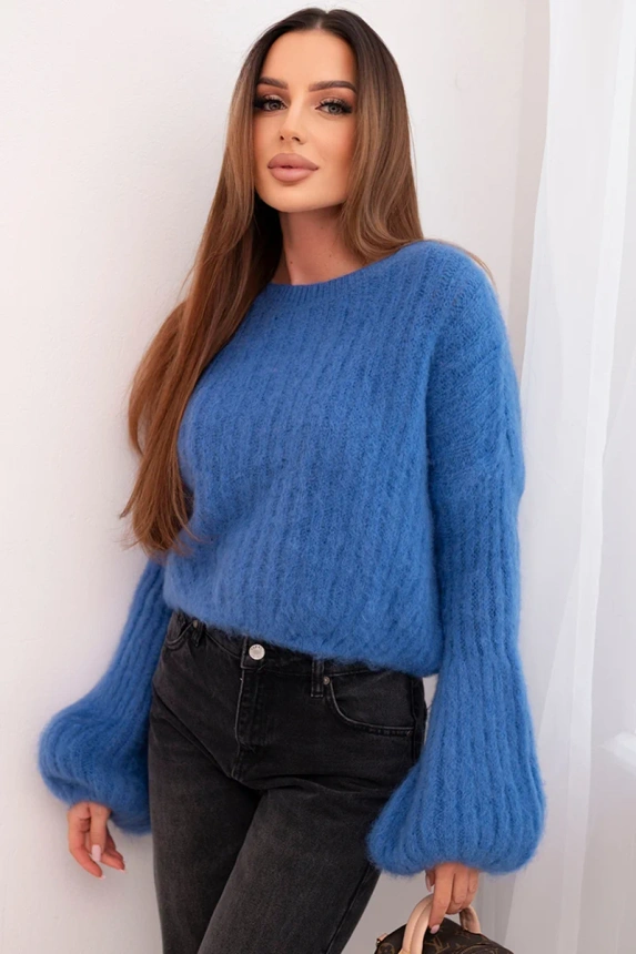 Stylový dámský svetr vyrobený z měkké směsi mohéru je ideální volbou na chladnější dny. Díky nadýchané textuře a volnému střihu se skvěle hodí jak do každodenních stylizací, tak do elegantnějších kombinací. Bufantové rukávy mu dodávají ženský půvab a módní charakter. Tento italský svetr není jen pohodlný, ale také vyjadřuje dobrý styl.