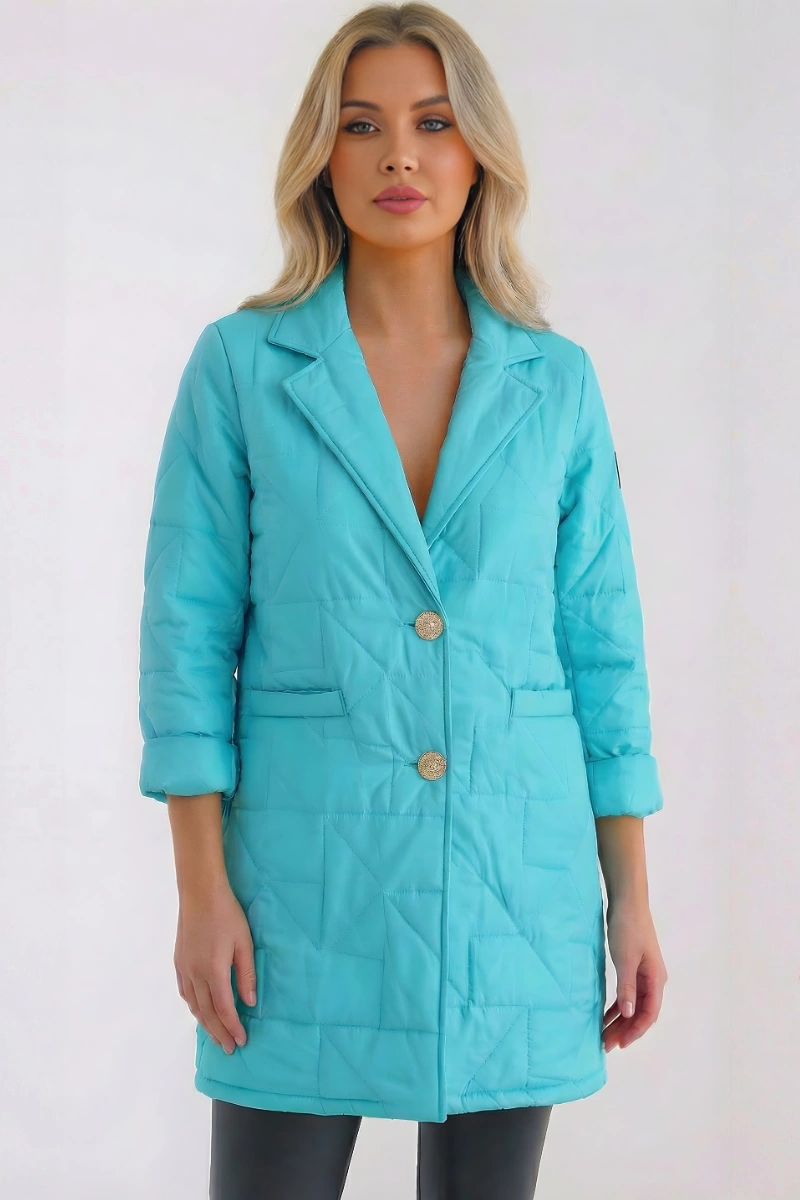 Stylová a praktická dámská prošívaná bunda je ideální volbou na chladnější dny. Model zapínaný na ozdobné knoflíky dodává eleganci, a klasický límec dodává celku šik vzhled. Prošívaná struktura zajišťuje nejen módní design, ale i tepelný komfort. Bunda má dvě praktické kapsy vpředu a délku zakrývající boky, což se skvěle hodí jak pro každodenní stylizace, tak na formálnější příležitosti.