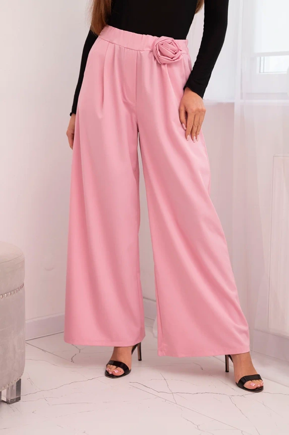 Dámské elegantní kalhoty s širokou nohavicí a ozdobným květem cukrově růžový