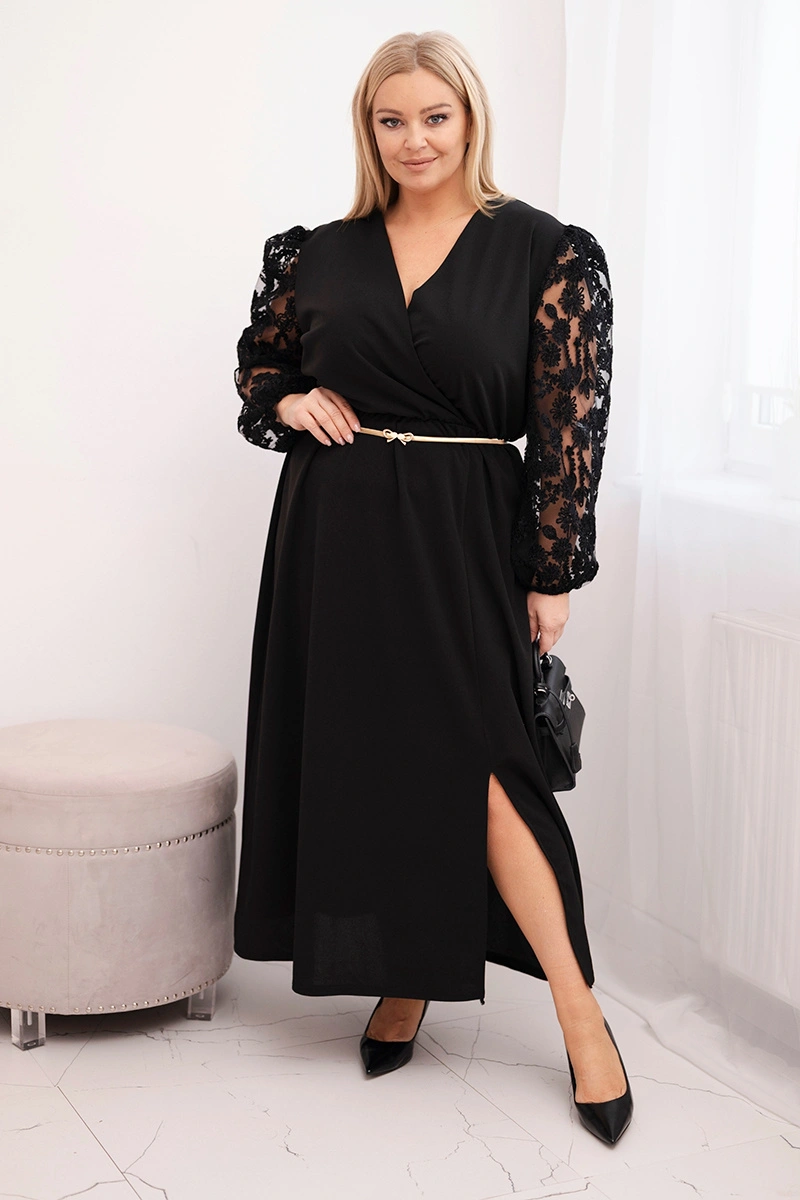 Tento elegantní dámský Plus Size šaty z viskózy jsou ideální volbou na výjimečné příležitosti. Zavinovací výstřih krásně zdůrazňuje linii poprsí a elastický pas zajišťuje pohodlné přizpůsobení postavě. Dlouhé krajkové rukávy dodávají celkovému vzhledu lehkost a eleganci, což vytváří působivý, ženský vzhled. Délka maxi vizuálně zeštíhluje postavu a prodyšný materiál se při pohybu skvěle usazuje.
