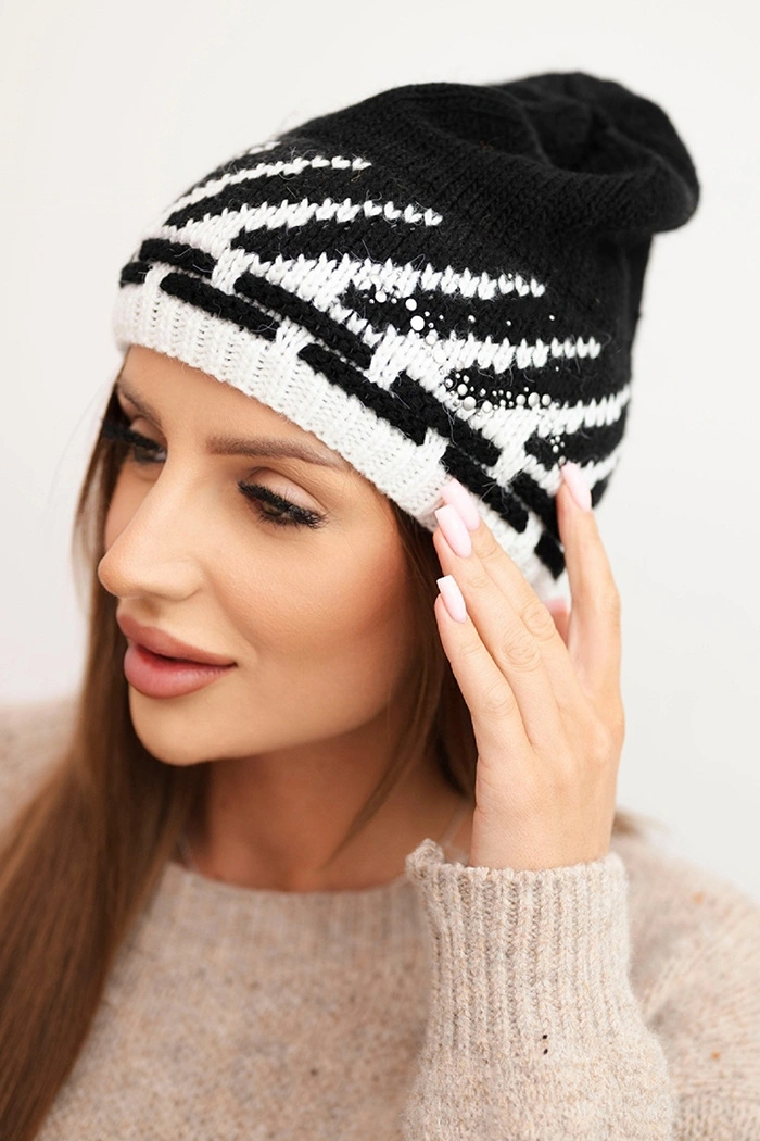 Dámská zimní čepice z vlny s geometrickým vzorem a kamínky K469 černá