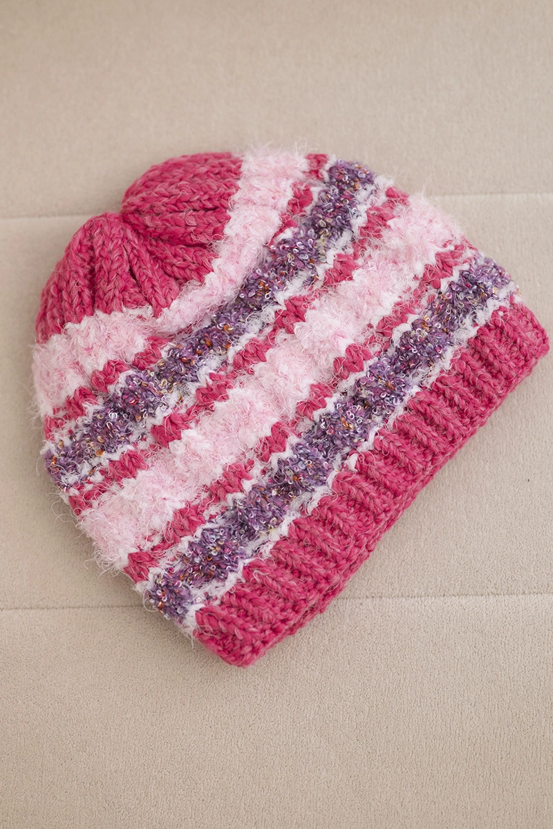 Stylová dámská čepice na zimu vyrobená z barevné, nadýchané příze s jedinečným vzhledem. Kombinace různých textur a barev jí dodává módní, pozornost přitahující charakter. Silný pletený vzor a elastický náplet zajišťují pohodlí nošení a účinnou ochranu před zimou a větrem.