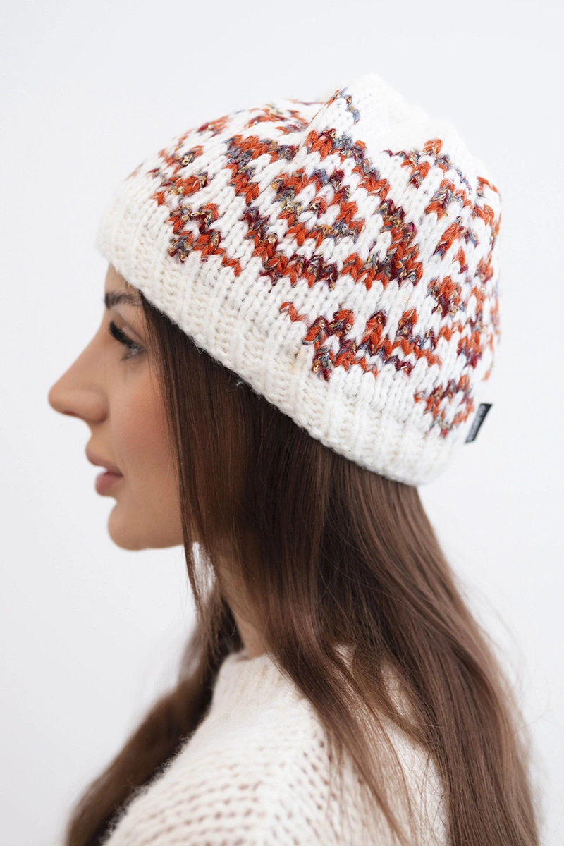 Dámská zimní čepice s barevnými vzory a silným nápletem K353 bílá+rezavá