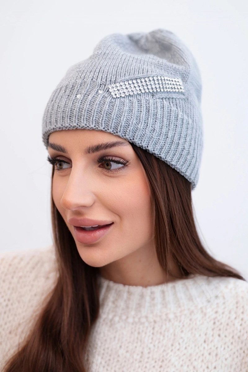 Dámská zimní vlnená čepice s ozdobným páskem z kamínků K402 šedá