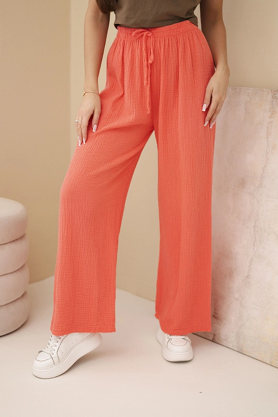 Objevte jedinečné kalhoty vyrobené z jemného, prodyšného mušelínu, které poskytují nevídaný komfort nošení i v nejteplejších dnech. Jejich široká nohavice dodává celému outfitu módní, moderní charakter, opticky prodlužuje postavu a přidává lehkost celkovému stylu. Ideální pro každodenní nošení, do práce i na výjimečné příležitosti – tyto kalhoty se skvěle kombinují s různými topy, od minimalistických triček, přes elegantní halenky až po svetry. Vsaďte na klasický, ale zároveň sofistikovaný design, který vám umožní užívat si pohodlí i originální styl. Velikost je univerzální a odpovídá ženám nosícím velikosti S, M nebo L.