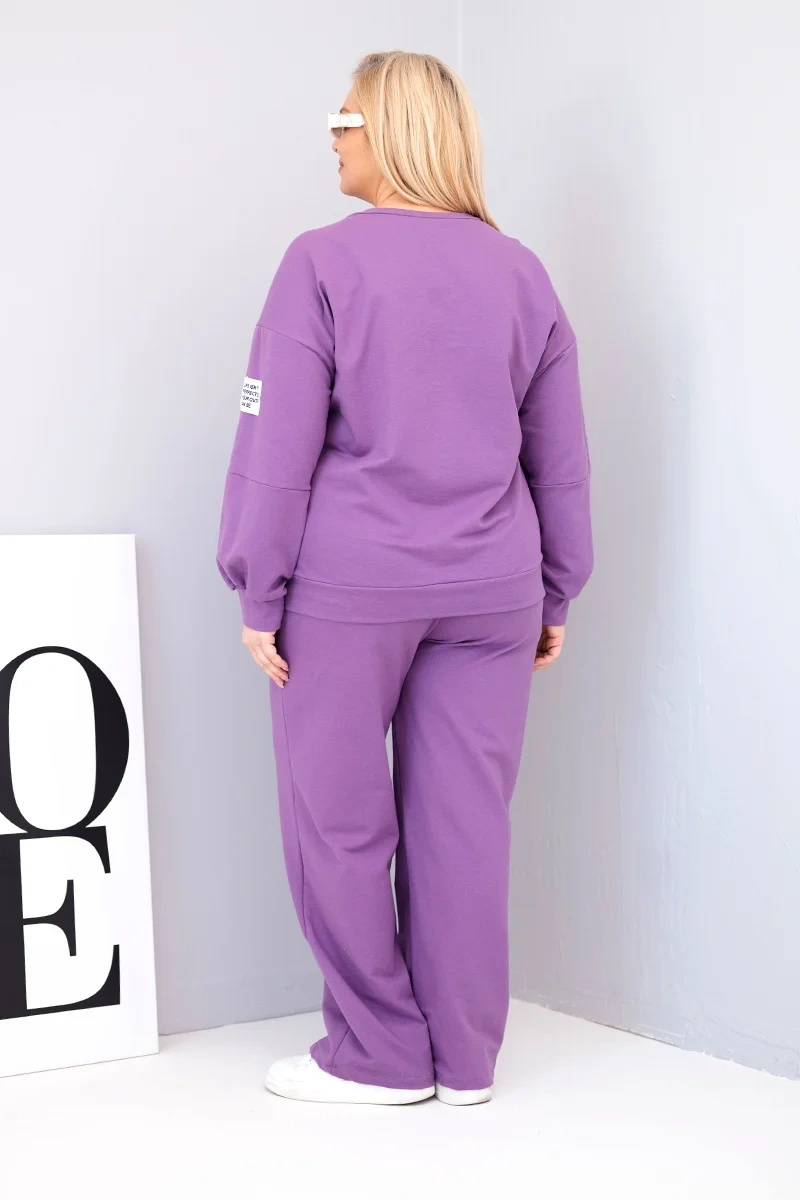 Dámská souprava Plus Size bavlněná s volnou mikinou a širokými kalhotami fialový