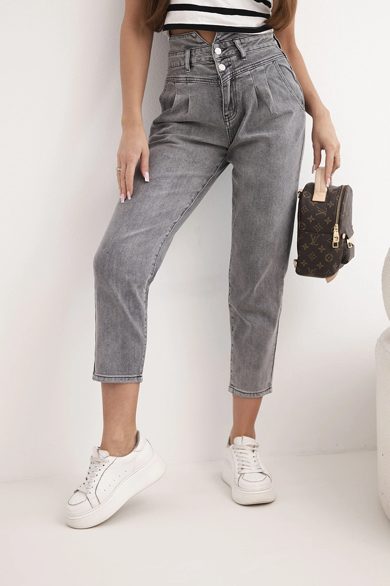 Tyto stylové dámské džíny s vysokým pasem a dvojitým zapínáním jsou skvělou volbou pro ženy, které ocení módní vzhled a pohodlí každodenního nošení. Střih typu paperbag s jemným nařasením v pase krásně zvýrazňuje postavu a mírně zúžené nohavice opticky prodlužují nohy.