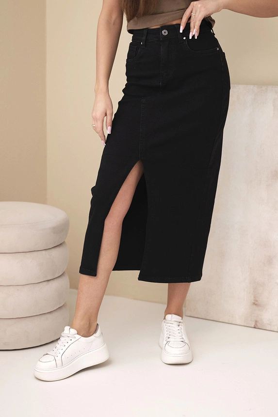 Tento dámský jeansová sukně s vysokým pasem je stylovou nabídkou pro ženy, které si cení klasických střihů a pohodlí na každodenní nošení. Midi střih krásně modeluje siluetu, zdůrazňuje pas a boky. Tmavý, jednobarevný denim dodává eleganci a zároveň činí sukni neuvěřitelně univerzální – ideální jak pro casual stylizace, tak i pro více ženské kombinace.