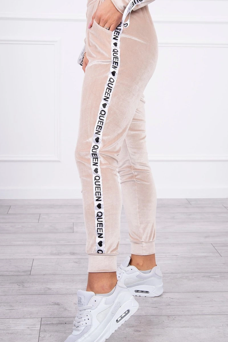 We present you a set of sweatshirts and pants. The set is made of velor. Sweatshirt with a neckline. A decorative tape with an inscription on the shoulders. At the bottom of the sweatshirt there is a sewn in rubber. Pants with pockets and a tape on the legs. A very fashionable and stylish set. The set is made of high quality material. The size is universal and will be suitable for ladies in sizes S, M or L.