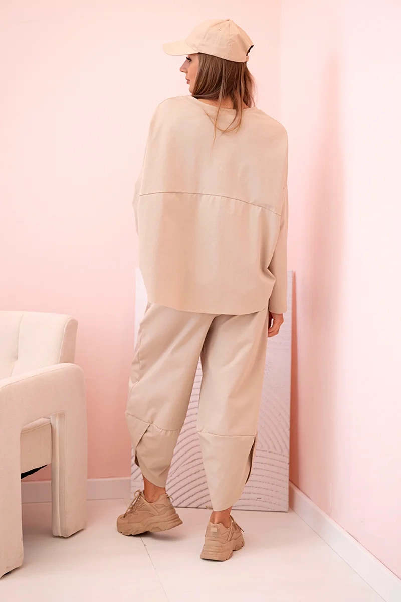 The Italian set is a combination of elegance and comfort that is perfect for many occasions. This fabric is not only soft and pleasant to the touch, but also looks beautiful. A sweatshirt is a perfect piece of clothing both for everyday use and for special occasions. You can wear it alone or combine it with another piece of clothing, creating an extremely stylish outfit. Trousers are the perfect complement to the set. Their loose cut allows freedom of movement, which makes them not only stylish, but also very comfortable. When choosing trousers, you choose comfort and elegance in one. The Italian set is an excellent choice for those who value high quality and unique style. Whether you're going to meet friends, work or go out for an evening out, this set will surely make you stand out from the crowd. The size is universal and fits women wearing size S, M or L.