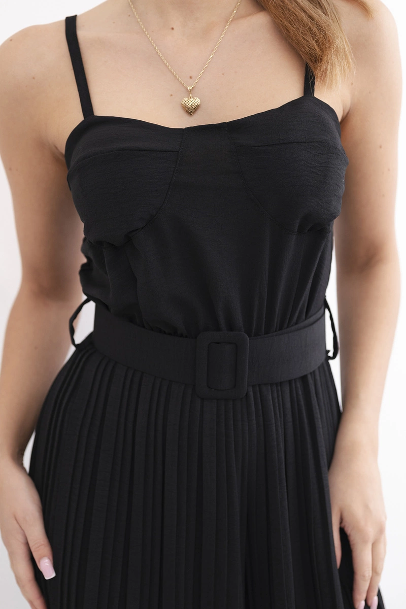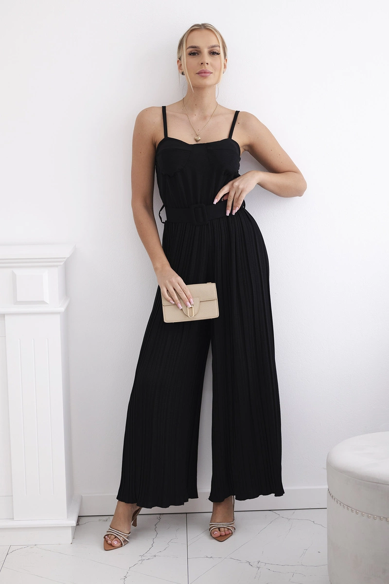 A pleated jumpsuit with straps is an elegant and sophisticated piece of clothing that adds subtlety and lightness to the female silhouette. Pleated fabrics are fashionable and add a unique character to clothes, and combining them with a jumpsuit creates an effective and stylish look. The straps give the suit delicacy and feminine charm, while ensuring comfort of wearing. It's the perfect option for many occasions, from summer parties to elegant evenings where you want to look both stylish and comfortable. Additionally, the jumpsuit is also practical because it constitutes a complete styling in one element, which makes it easier to compose an outfit. The size is universal and will fit people in sizes S, M and L.