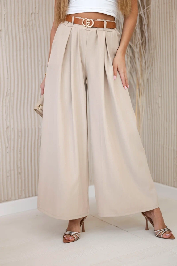 Stylish wide-leg trousers are a perfect choice for women who appreciate comfort and a fashionable look. Made from high-quality fabric, they fit beautifully on the body, enhancing its features. The included belt allows for a perfect waist adjustment, adding an elegant touch. Thanks to the wide-leg cut, the trousers look exceptionally chic while ensuring freedom of movement. Ideal for both everyday outfits and more formal occasions – they pair perfectly with an elegant blouse, shirt, or fitted sweater. The universal size fits women wearing sizes S, M, or L.