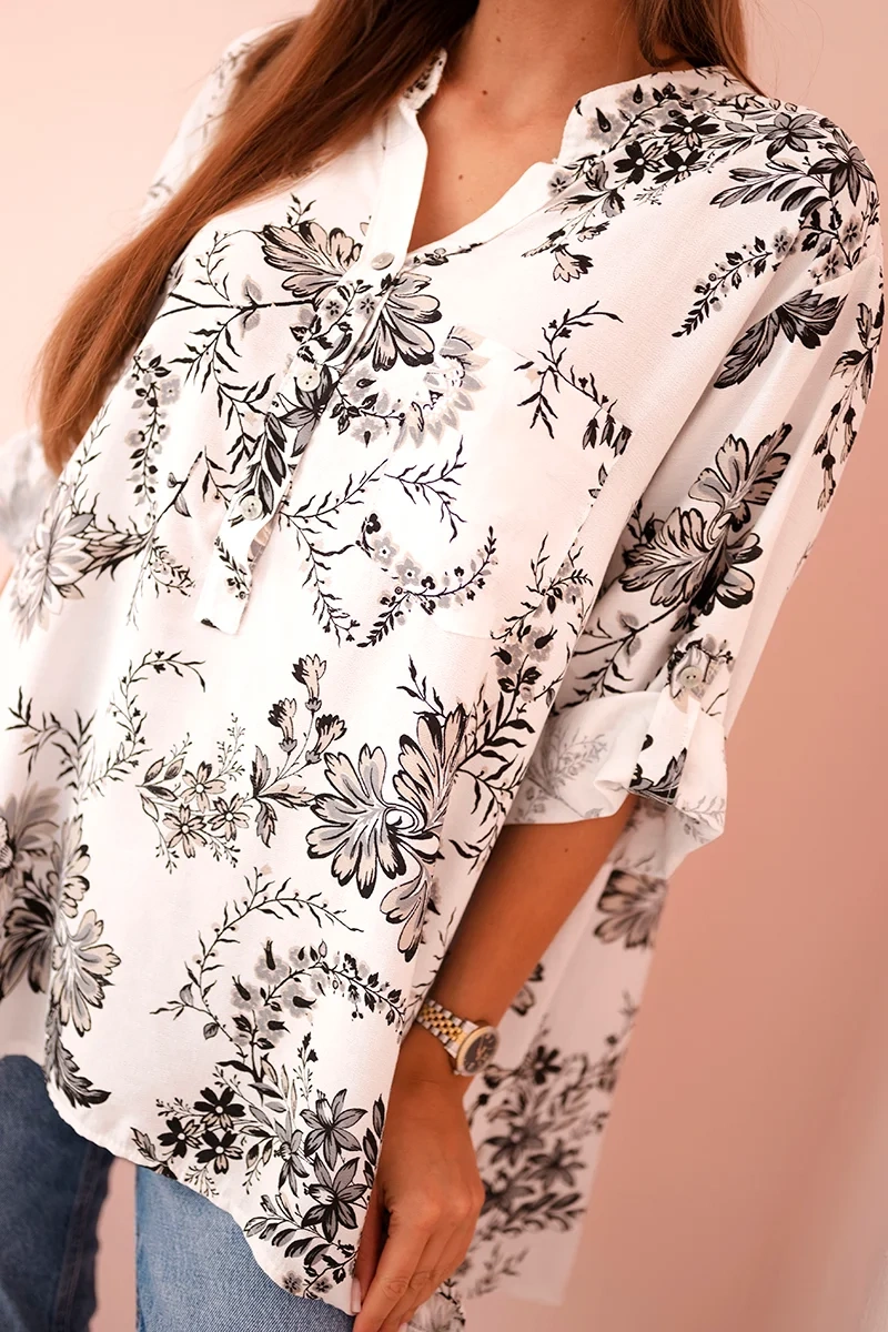 Stylish women's shirt with a V-neckline and a beautiful floral pattern – the perfect choice for everyday wear and special occasions. The loose fit ensures freedom of movement, while the delicate fabric is soft to the touch and comfortable to wear. The shirt features 3/4-length sleeves and a subtle button closure that adds elegance. It pairs perfectly with jeans or elegant trousers. Universal size, suitable for women wearing S, M, or L.