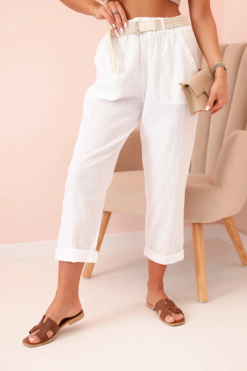 Light and breathable women's trousers made from a natural blend of linen and cotton are the perfect choice for warmer days. The model features an elastic waistband that adjusts well to the figure and includes a stylish belt that adds character to the look. The legs are slightly rolled up, enhancing the casual summer vibe. These trousers are extremely comfortable and functional – suitable for both everyday and more elegant outfits.