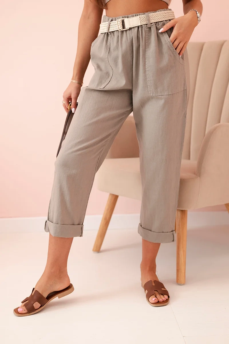 Light and breathable women's trousers made from a natural blend of linen and cotton are the perfect choice for warmer days. The model features an elastic waistband that adjusts well to the figure and includes a stylish belt that adds character to the look. The legs are slightly rolled up, enhancing the casual summer vibe. These trousers are extremely comfortable and functional – suitable for both everyday and more elegant outfits.