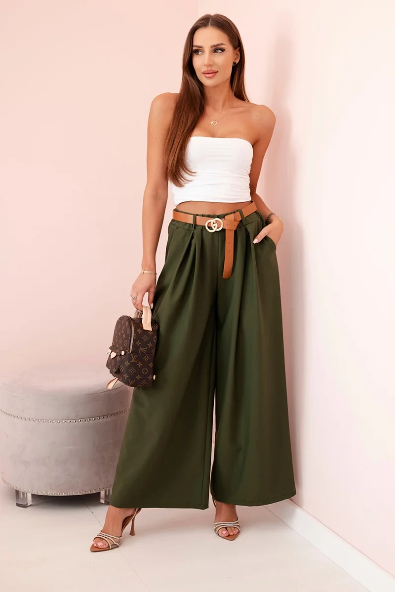 Stylish wide-leg trousers are a perfect choice for women who appreciate comfort and a fashionable look. Made from high-quality fabric, they fit beautifully on the body, enhancing its features. The included belt allows for a perfect waist adjustment, adding an elegant touch. Thanks to the wide-leg cut, the trousers look exceptionally chic while ensuring freedom of movement. Ideal for both everyday outfits and more formal occasions – they pair perfectly with an elegant blouse, shirt, or fitted sweater. The universal size fits women wearing sizes S, M, or L.