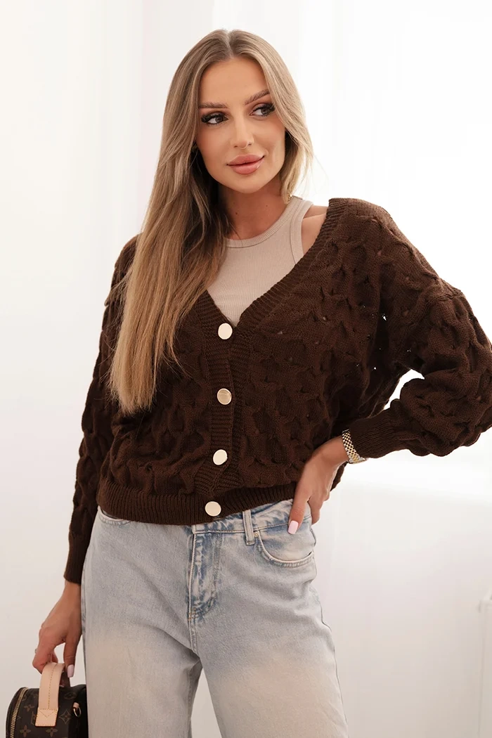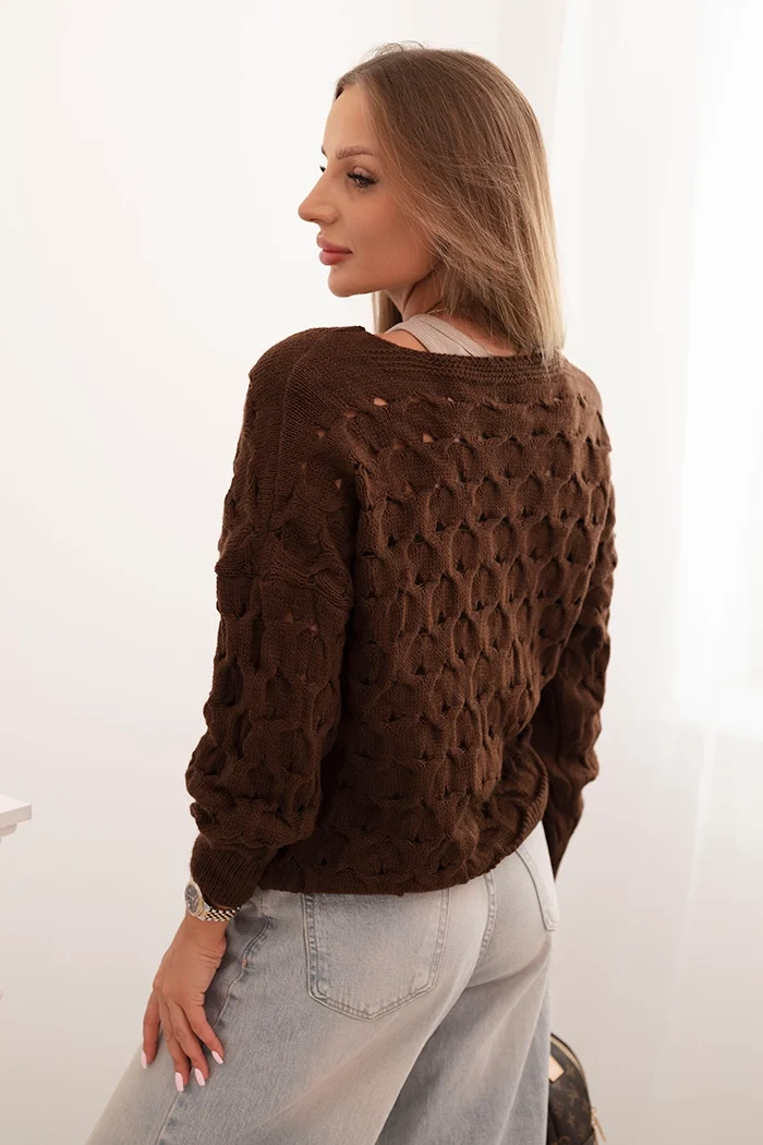 This charming women's sweater with an openwork knit is a perfect choice for women who value elegance and comfort. The model is fastened with striking gold buttons and features a deep V-neckline, giving it a subtle charm and feminine character. The loose fit ensures it drapes well on the figure without restricting movement, making it suitable for both jeans and skirts. The sweater is an excellent choice for cooler days – wear it to work, for a walk, a meeting with friends, or as part of a casual outfit. The lightweight and breathable openwork fabric provides all-day comfort. The size is universal and suitable for women wearing sizes S, M, or L.
