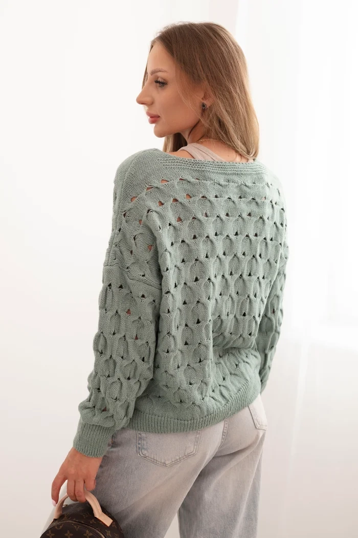 This charming women's sweater with an openwork knit is a perfect choice for women who value elegance and comfort. The model is fastened with striking gold buttons and features a deep V-neckline, giving it a subtle charm and feminine character. The loose fit ensures it drapes well on the figure without restricting movement, making it suitable for both jeans and skirts. The sweater is an excellent choice for cooler days – wear it to work, for a walk, a meeting with friends, or as part of a casual outfit. The lightweight and breathable openwork fabric provides all-day comfort. The size is universal and suitable for women wearing sizes S, M, or L.