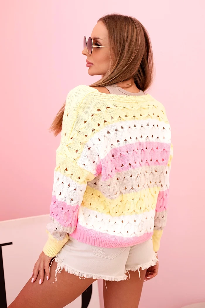 This charming women's cardigan in colorful stripes is the perfect choice for any season. Made from soft, pleasant-to-the-touch acrylic, it works great for cooler days as well as a stylish addition to spring outfits. The openwork pattern gives it lightness and feminine charm, while the classic V-neck beautifully highlights the neck. The cardigan fastens with buttons, adding practicality and allowing it to be worn in many ways – both open and closed. It is an excellent choice for women who value comfort, color, and a fashionable look. Thanks to the pastel colors, it can be easily matched with many styles – from casual to more romantic outfits. It looks great with jeans, a skirt, or a dress. The size is universal and will fit women in sizes S, M, or L.
