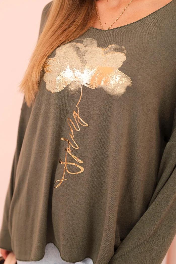 Women's blouse with an eye-catching gold print in the form of a floral motif is a great choice for women who value comfort combined with subtle elegance. Made from a pleasant-to-touch material, it is perfect for everyday wear as well as for more casual work outfits or meetings with friends.